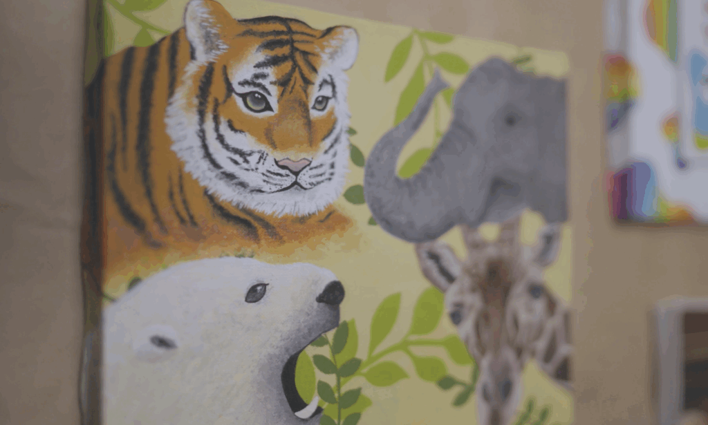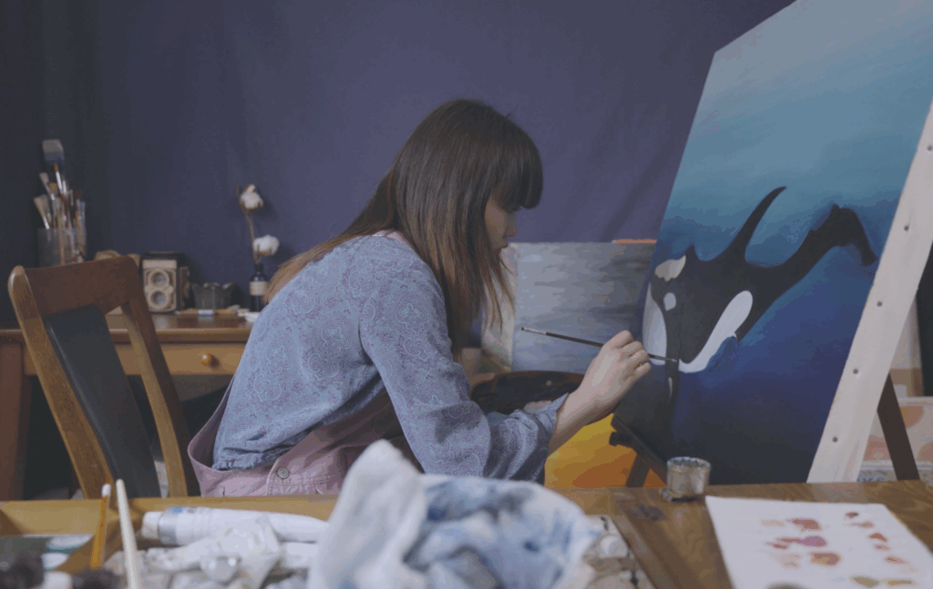 幼少期から絵を描き続けてきた彼女にとって、画家になることは当然の夢であった。しかし、その道を歩む中で、彼女は一つの大きな転機を迎えることになる。それは、作品のモチーフを探求する過程で、自身の過去と向き合うという挑戦だ。当初はただ漠然と美しい風景や物を描いていたが、ある時、幼い頃の記憶や、言葉にできなかった辛い感情が、絵を描くことによって消化されていくことに気づいた。その瞬間から、彼女にとって絵を描くことは、単なる表現行為を超え、自己を癒し、受け入れるための儀式へと変わった。特に、動物をモチーフに選ぶことが多いのは、彼女自身が「動物は苦手」だと感じているからだという。苦手なものをあえて描くことで、内なる葛藤と向き合い、それを乗り越えるためのプロセスを作品に閉じ込めている。